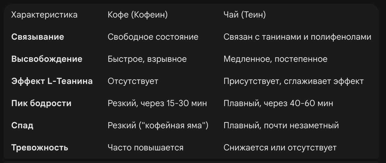 Они работают в синергии: Теин не дает вам уснуть, а L-Теанин не дает вам нервничать. Вы получаете фокус и чистую энергию без привычного кофейного «дрожания рук».